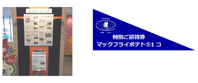 | 亀岡市では、安全向上に向けた取り組みのために、地域の企業との連携を様々な形で進めています。 ●企業等のドライブレコーダーを「動く防犯カメラ」として効果的に活用するため、京阪京都交通株式会社、京都タクシー株式会社、有限会社楠新聞舗、社会福祉法人 倣襄会と「亀岡市ドライブレコーダーによるまちの見守り協定」を締結しています。 詳細については、亀岡市のウェブサイトに掲載されています。 ●より多くの方がSC活動を知っていただくため、「セーフコミュニティニュース」を隔月で発行しており、自治会や公的機関に配架していますが、新たにコンビニネットワーク加入店やマクドナルドの協力を得て、店内で掲示しています。この広報誌には、マクドナルドからのご厚意で「マックフライポテト?1コ」無料クーポンがついています。 また、市内のマクドナルド2店舗では、防犯ボランティア活動の打ち合わせで利用する場合、飲食代の優待をうけられるなど、防犯活動への支援も行っています。 |